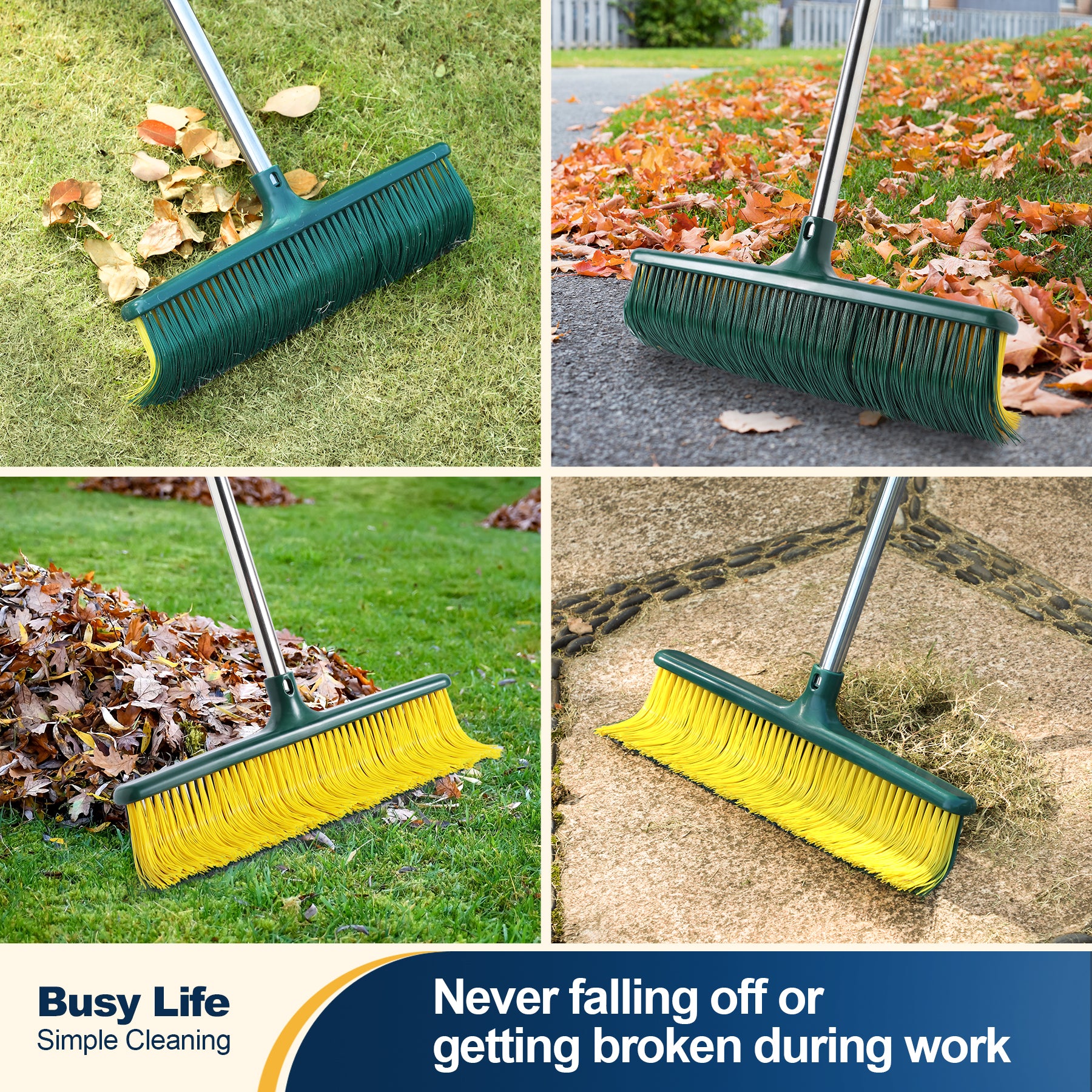 The Yocada Heavy-Duty Broom is designed for efficient cleaning across various surfaces. It features a durable stainless steel pole that is height-adjustable up to 58.7 inches, helping to reduce back strain during use. The broom head boasts 14.9-inch curved bristles, expertly designed to capture leaves and debris effectively without causing damage to your lawn. Its stylish green and yellow design makes it a versatile tool suitable for indoor, outdoor, and garden cleaning tasks, combining robust durability with excellent performance for all your sweeping needs.