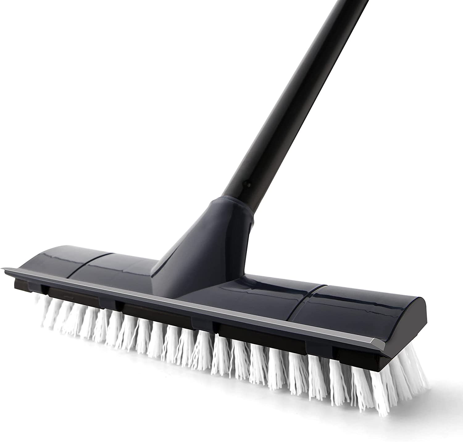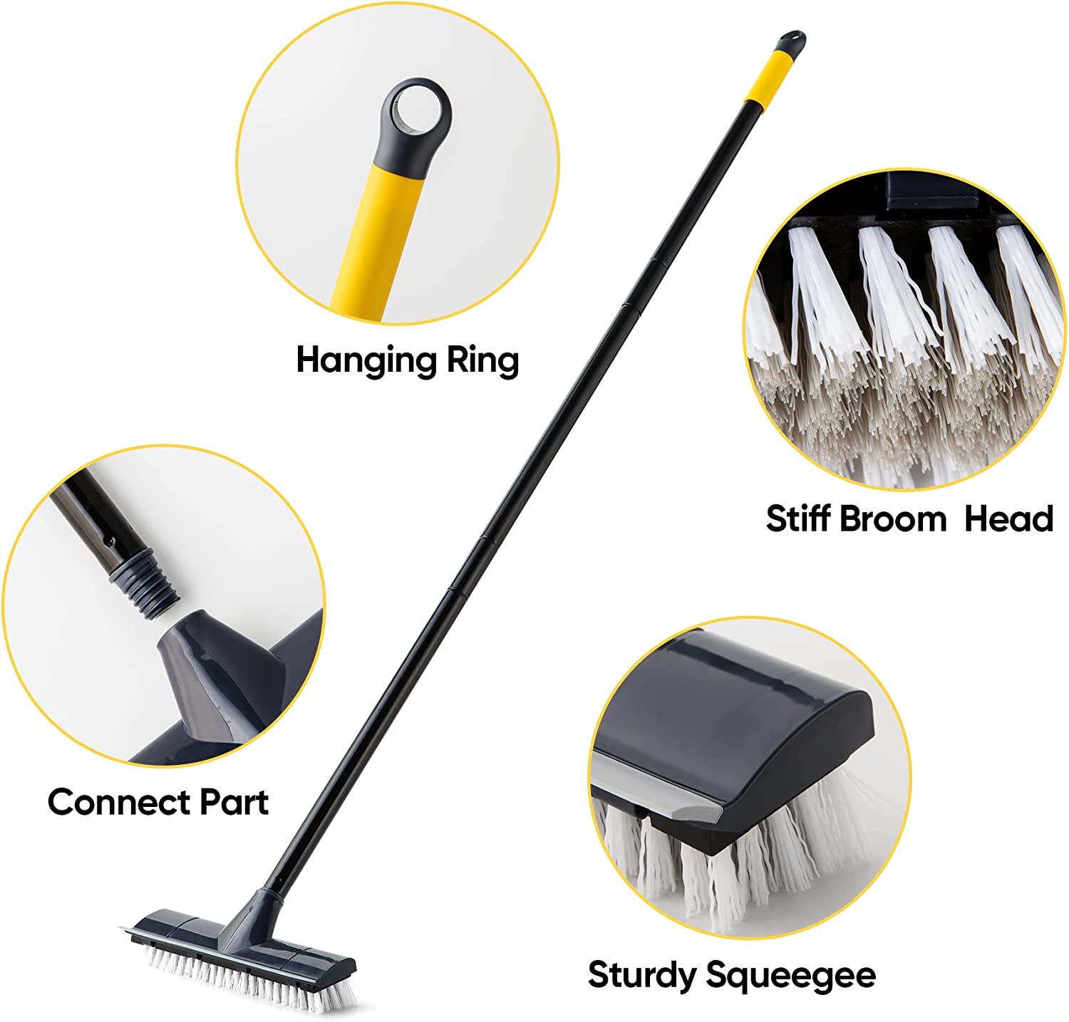 - Floor Scrub Brush 2 in 1 Scrape&brush Push Broom Effective, Easy & Save Effort Brush + scraper 2 in 1 design floor scrub brush with stiff bristle + rubber squeegee; Strong cleaning ability; Brush + scrape steps to easily remove the stain, stubborn grime, dirty water, and dust; Improve effectiveness when you doing housework.