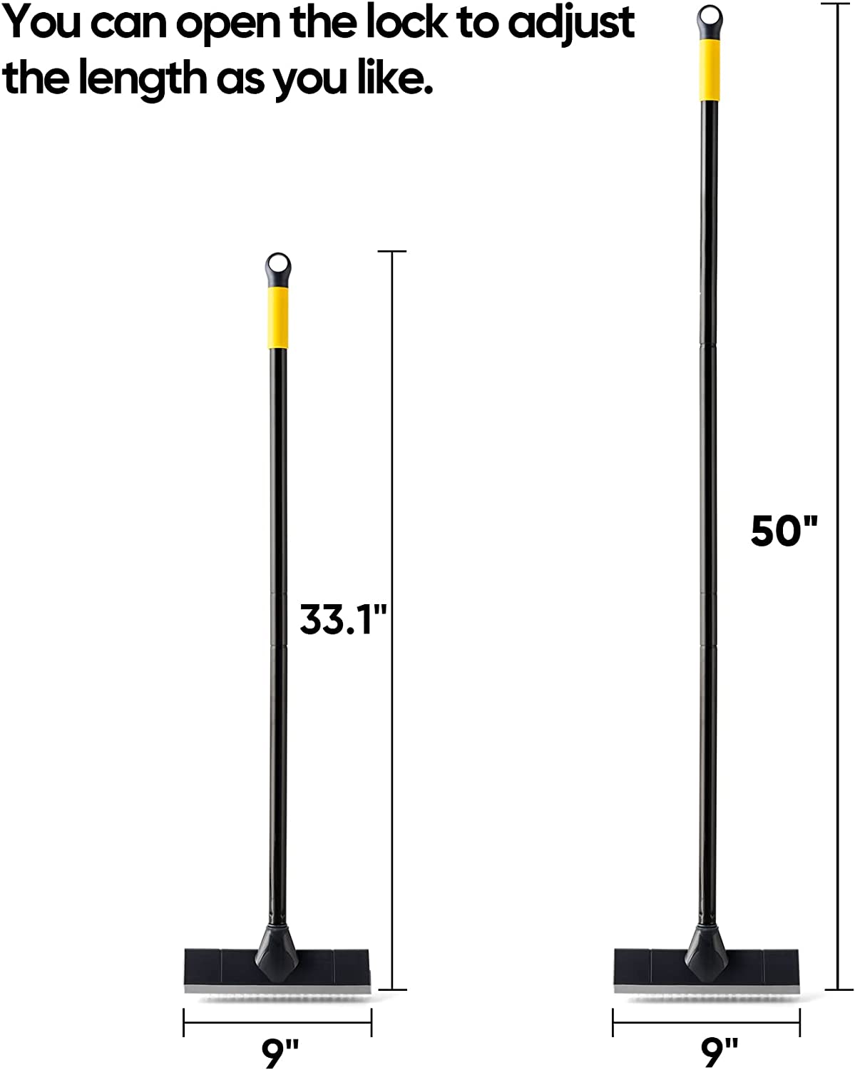 - Floor Scrub Brush 2 in 1 Scrape&brush Push Broom Long Handle: The iron pole length can be adjusted from 33.1 inches to 50 inches, and the brush head is about 9 inch long, so you don't need to bend your back.