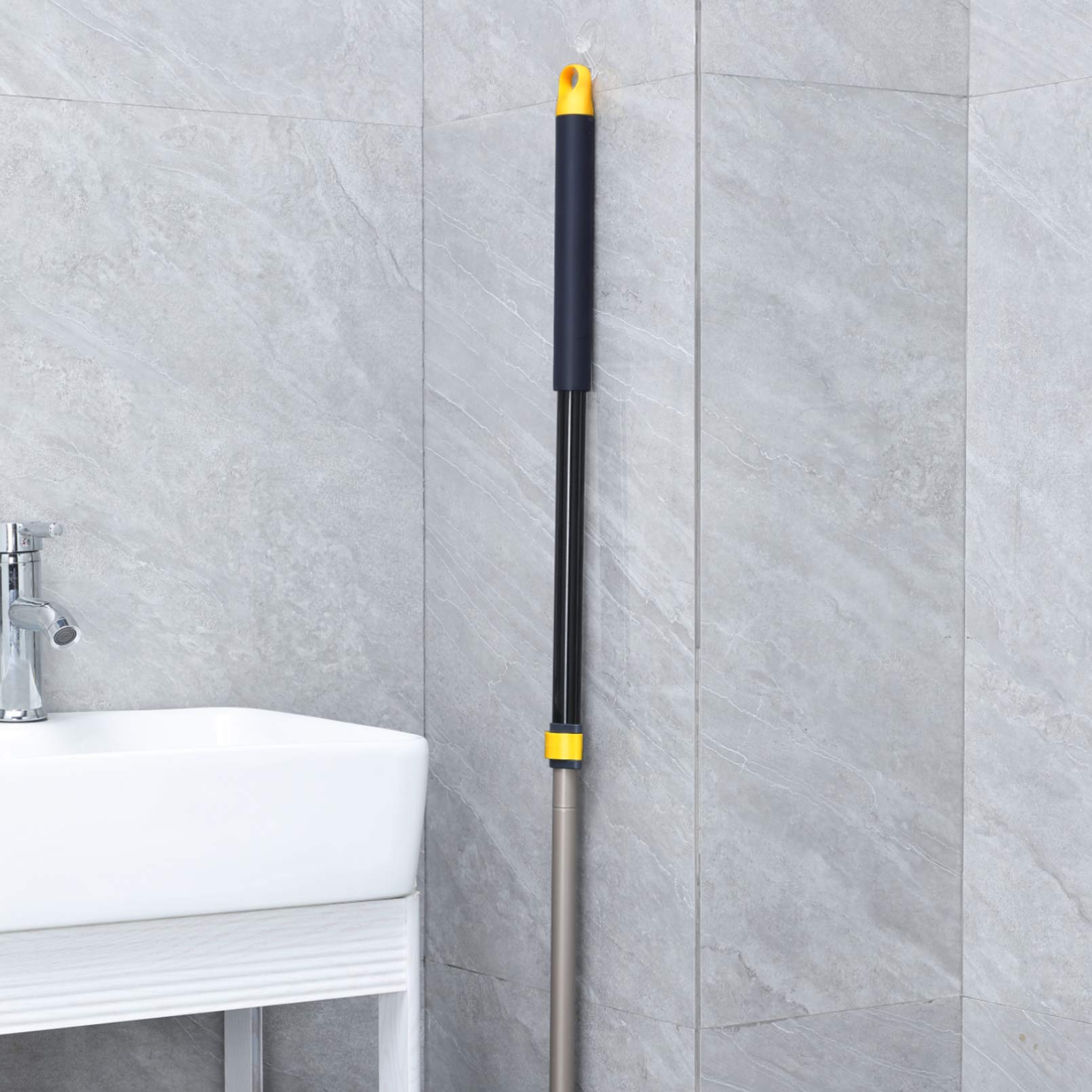- Our broom head looks like it's used, but it's new because it's the special technology we've added to it. Note: Push Broom Brush Telescopic Rod: The iron rod length can be adjusted from 43.3 inches to 54 inches, just open the lock on the rod to adjust, no need to bend over.