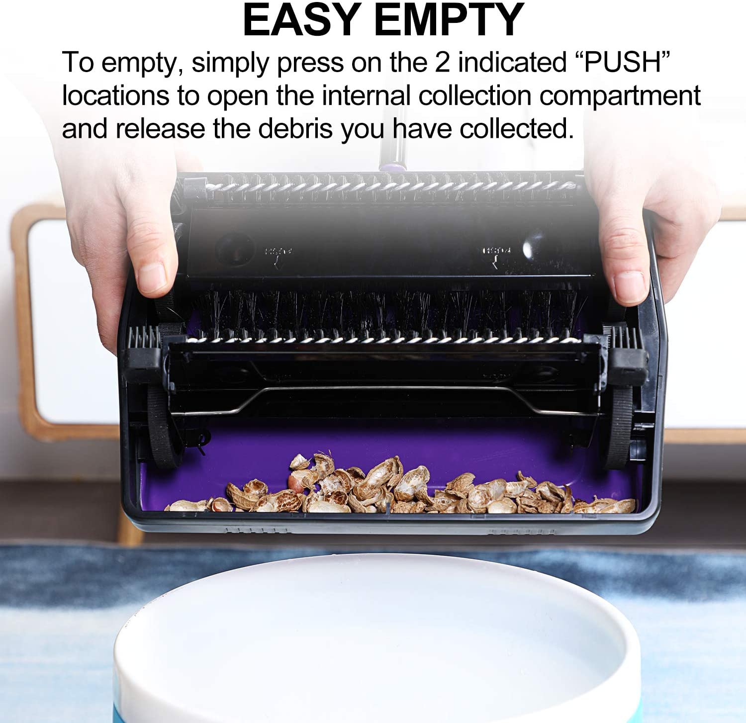 - ▲▲▲Carpet Sweeper NO DUST PAN: There is no dustpan to deal with. You can easily empty the garbage by pressing the button on the sweeper.