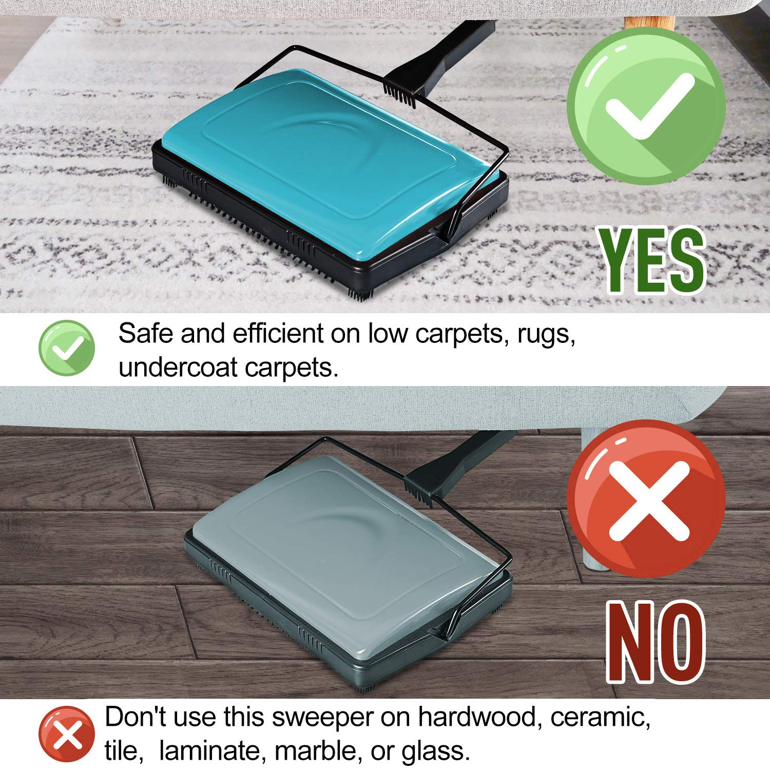 - ▲▲▲Carpet Sweeper MULTIFUNCTIONAL: Safe and efficient on low carpets, rugs, undercoat carpets. ▲▲▲Please DON'T use it on floors like hardwood, ceramic, tile, laminate, marble or glass. It only works best on carpets!