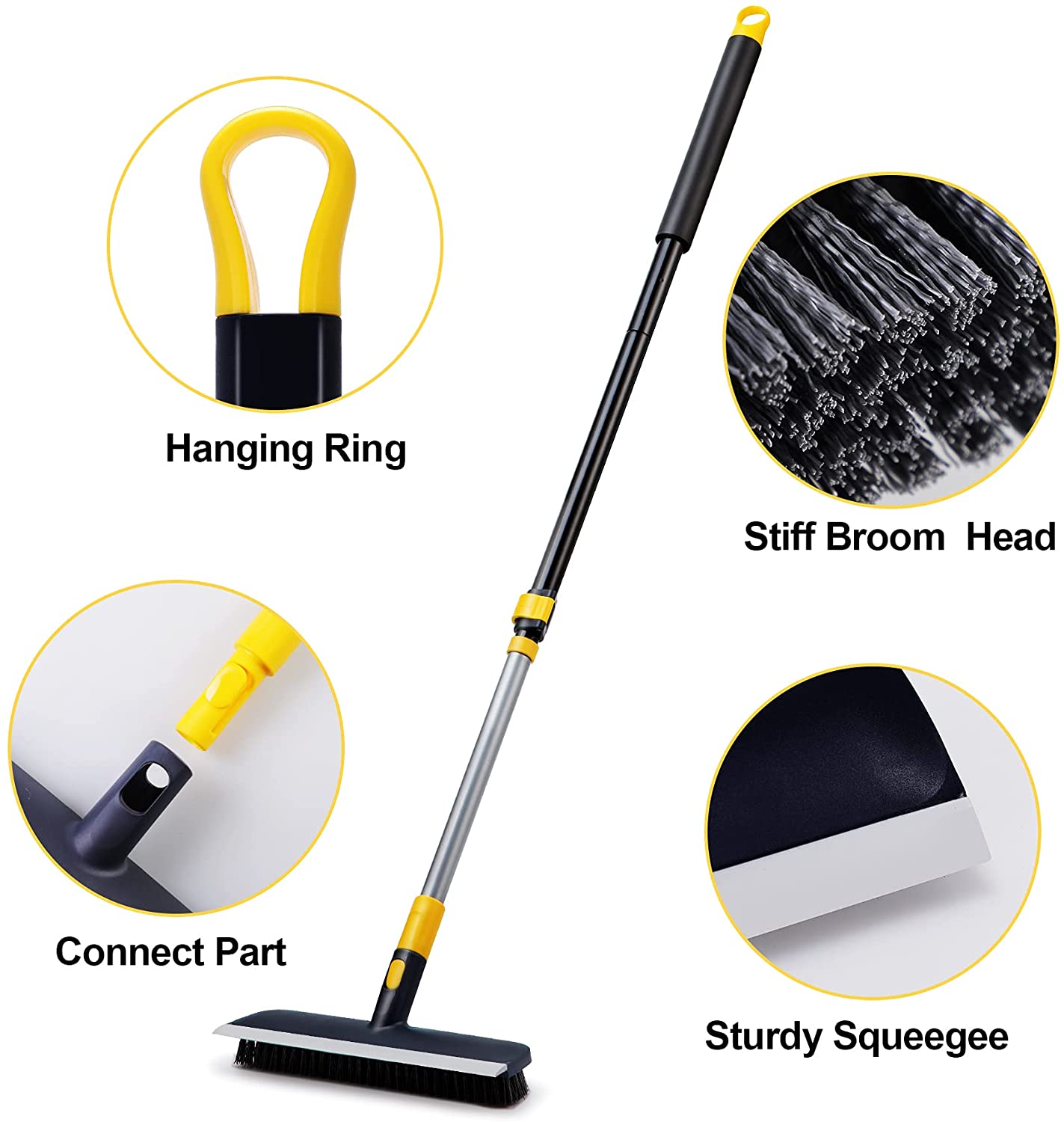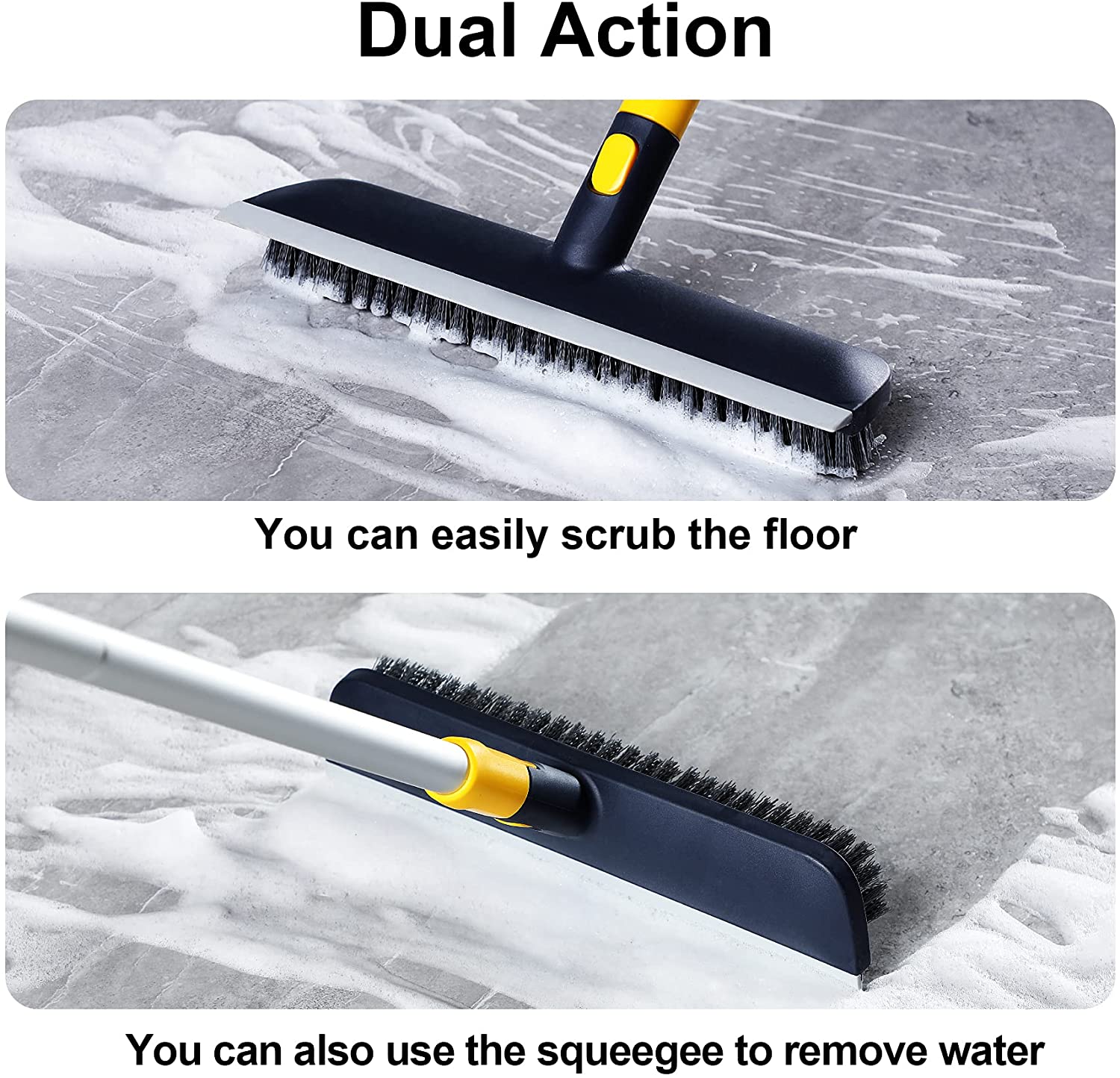 - Floor Scrub Brush 2 in 1 Scrape&brush Push Broom Effective, Easy & Save Effort Brush + scraper 2 in 1 design floor scrub brush with stiff bristle + rubber squeegee; Strong cleaning ability; Brush + scrape steps to easily remove the stain, stubborn grime, dirty water, and dust; Improve effectiveness when you doing housework.